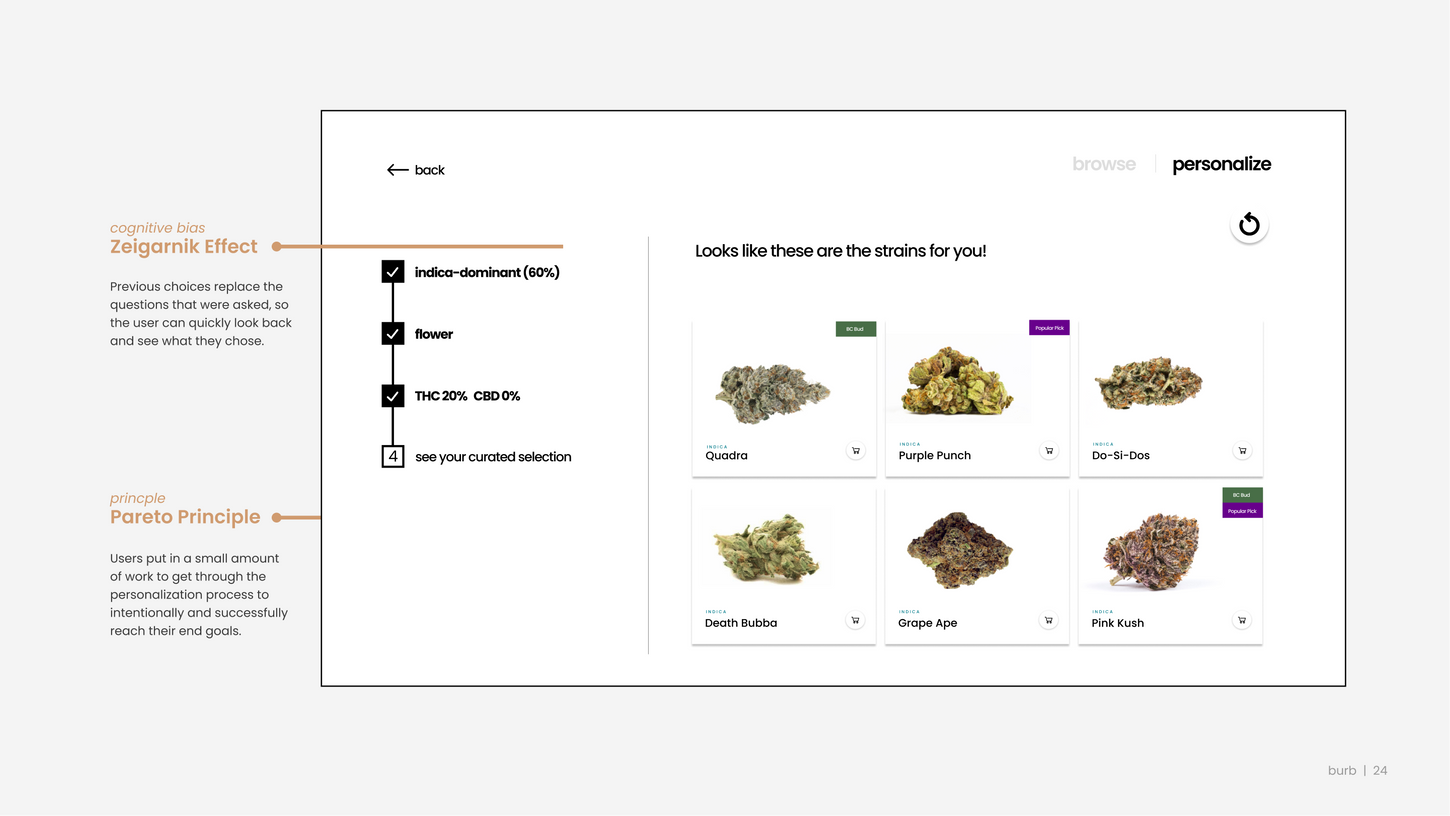 We proposed and implemented a conceptual interaction design intervention for an e-commerce site, based on a client of our choosing. We chose to recreate Burb Cannabis’ online shopping experience by re-integrating the ‘BC Bud culture’ on their homepage and designing an intuitive, user-friendly cannabis selection experience for consumers who are new to the legal market.